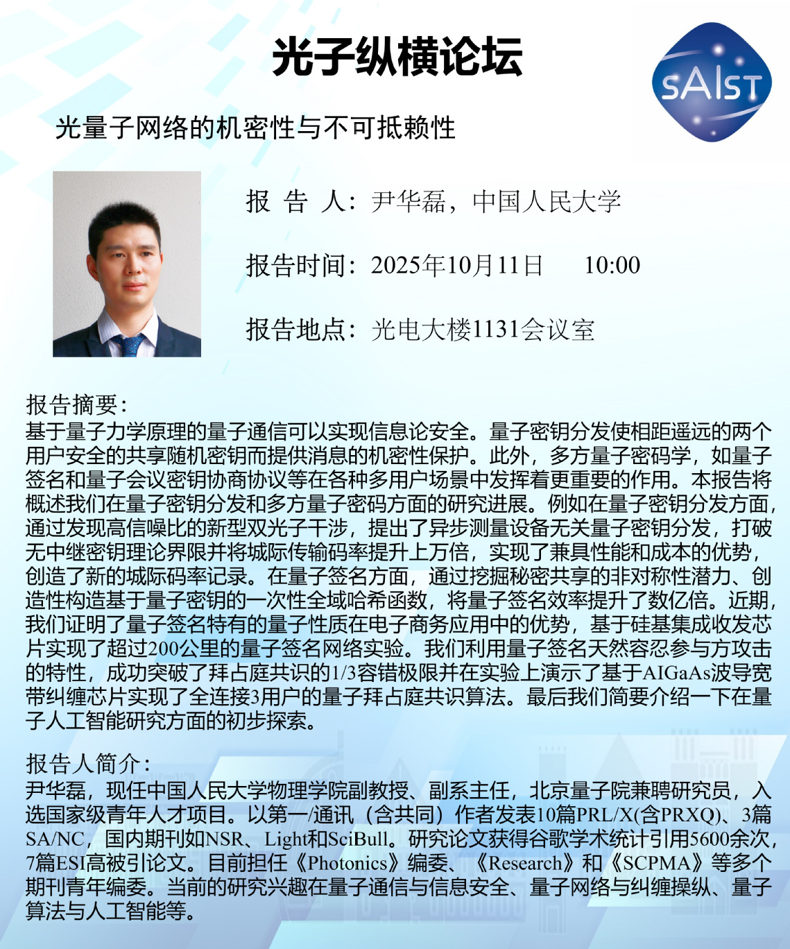【活动预告】光子纵横论坛—光量子网络的机密性与不可抵赖性