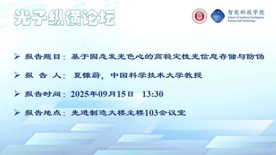 【活动预告】光子纵横论坛—基于固态发光色心的高稳定性光信息存储与防伪